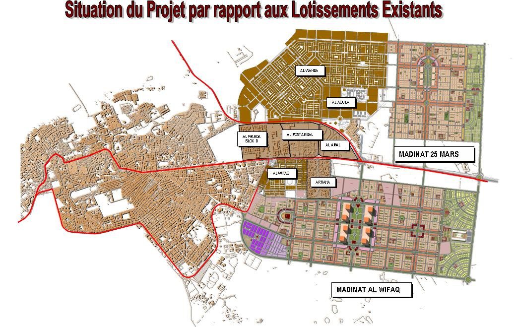 Le présent projet a pour objet l’élaboration des études techniques de voirie, assainissement, AEP, électrification 2°/1° catégorie, éclairage public, Génie civil et câblage téléphonique et le suivi, pilotage et contrôle des travaux de VRD du programme de 20 000 lots d’habitat –MADINAT AL WIFAQ d’une superficie de 456 ha et dont le montant des travaux s’élève à 520.20 Millions de dirhams